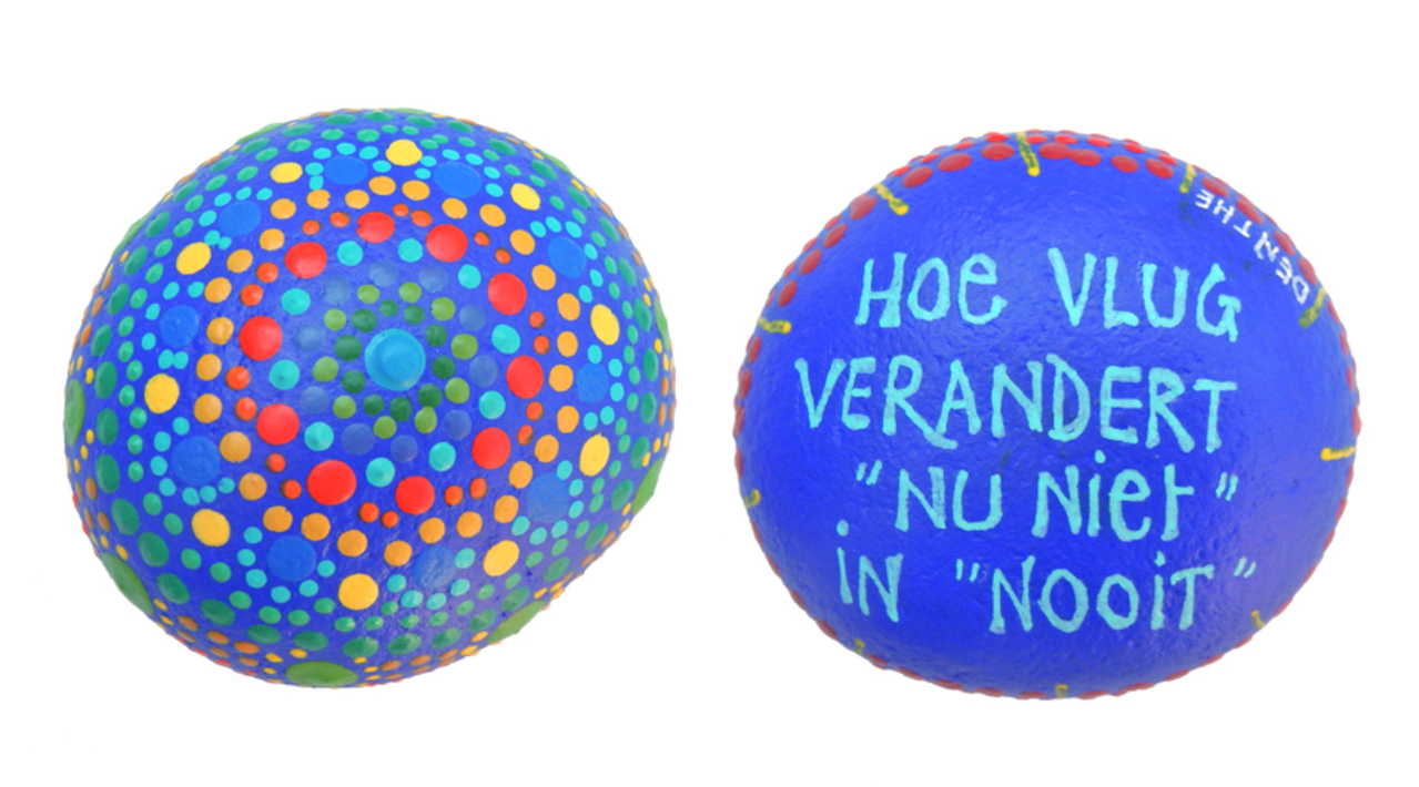 beschilderde steen met dotpainting aan de ene kant en spreuk aan de andere kant