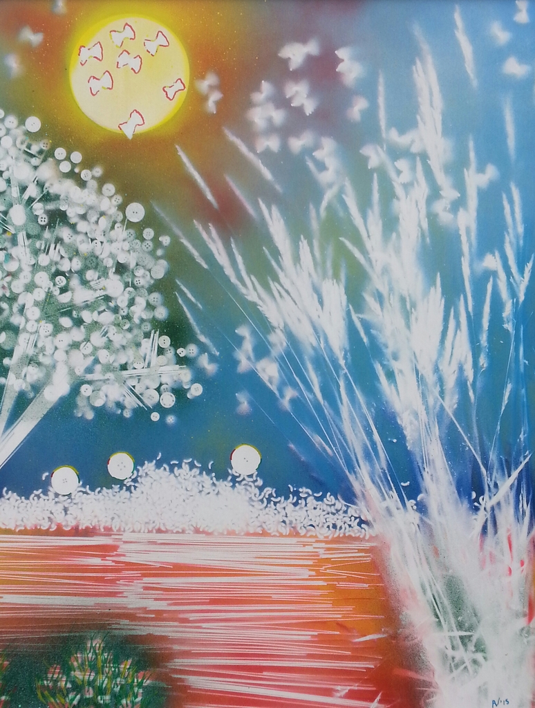 Dit schilderij is grotendeels gespoten met (soms zeer alledaagse dingen als) sjablonen. Welke ontdek jij?