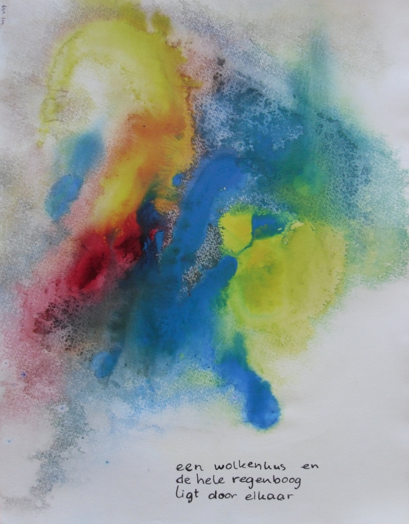 een wolkenkus en de hele regenboog ligt door elkaar monoprint in aquarel met tekst