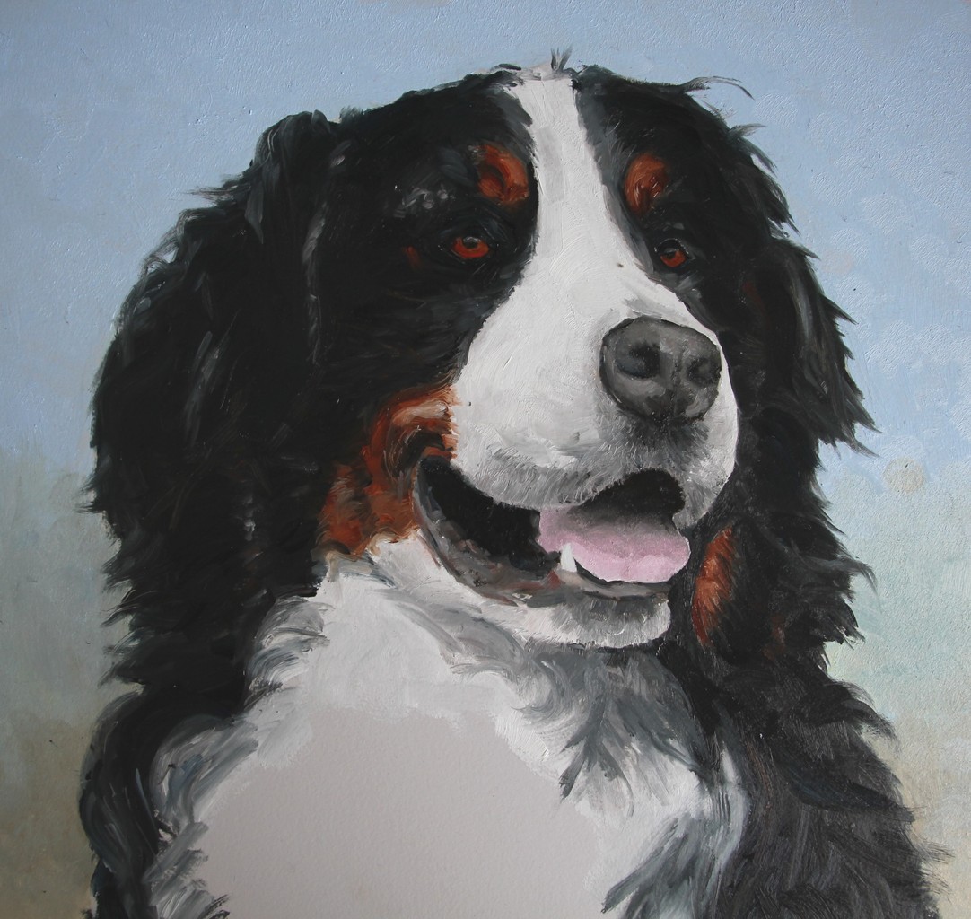 Figuratief Bernersennen Realistisch Hond Huisdier Fijnschilderen Fijnschilderij Alpen Sennenhond Alps Naturalistisch Opdracht Pets Pet Cute Mooi Naturel Nature Animal Dog Oilpainting Oil Paneel Panel Longhair
