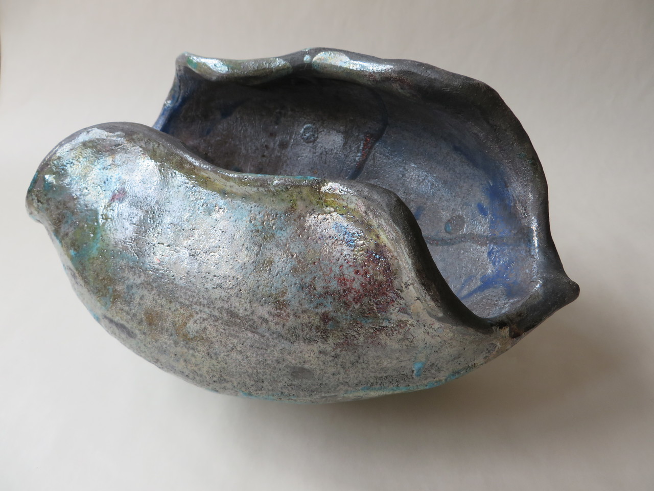 Raku gestookt. Net als open turtle shell: een schildpadschild dat van onder open is gewerkt, zodat ook de binnenkant getoond kan worden. Raku gestookt.