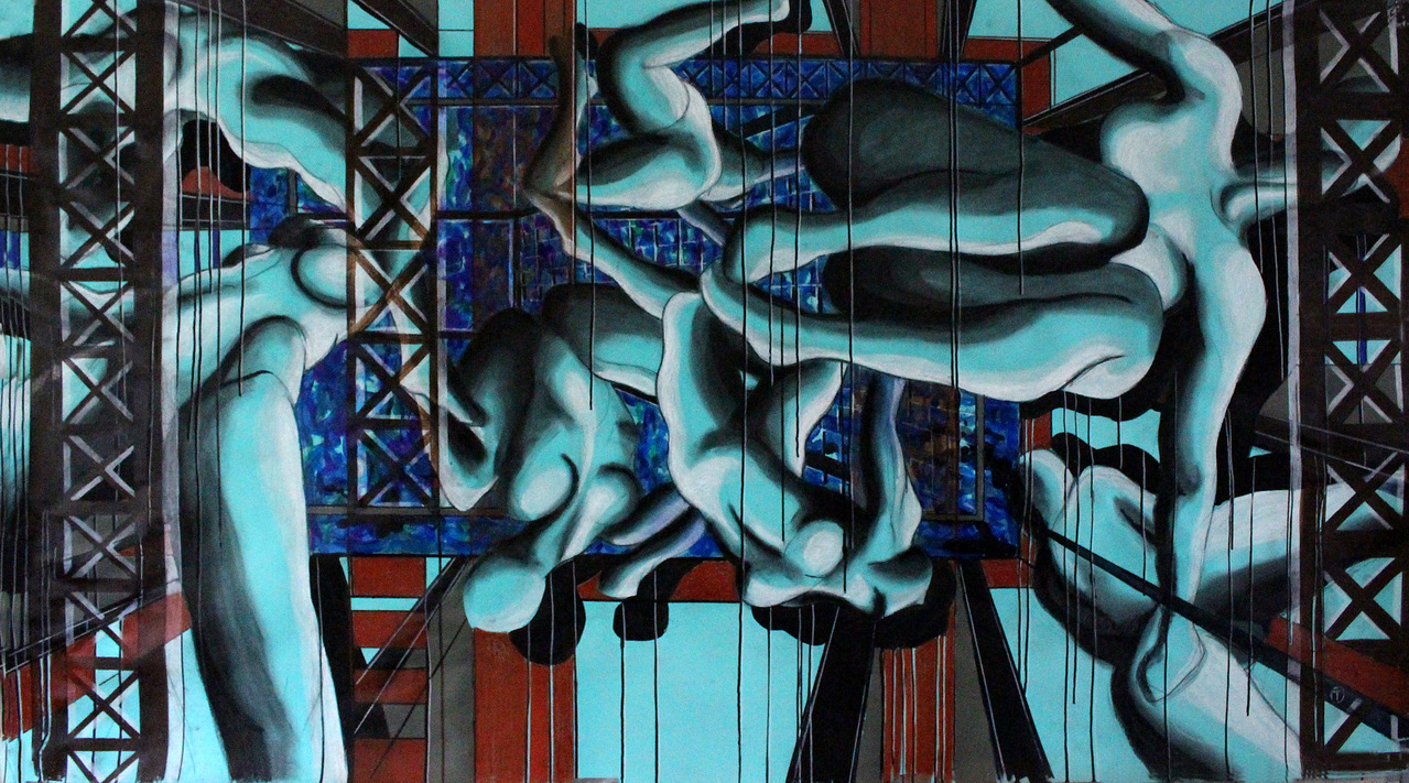 Drawing is a discipline in which ‘looking outside’ and ‘looking and moving within the frame of the paper’ is very important. Sources of inspiration are urban and industrial landscapes and shapes of the human body. Tom’s work consists of countless shades of black but he also uses colour in an exciting way. The artworks change as the daylight changes. Observations and impressions from spending time outdoors inspire his artwork. His skilled drawings may develop into new drawings as well as paintings. In his paintings he combines colour, patches and blots with lines to create several spaces.