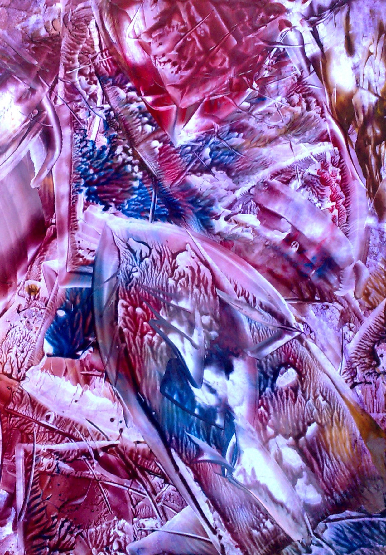 Kris, kras, gemengde gevoelens door elkaar heen. Hele blije, vrolijke , felle kleuren, tevens ook wat meer zwaardere kleuren, duidt op gemengde gevoelens. Toen ik dit werk maakte was mijn stemming zo ook, dus dat heb ik mooi uit kunnen beelden.