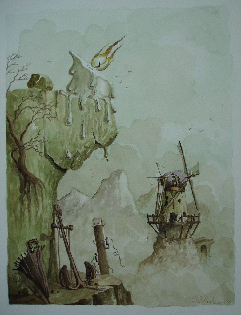 Bergen Anker Paraplui Kaars Molen Landschap Realisme Romantiek Fantasie Papier Aquarel