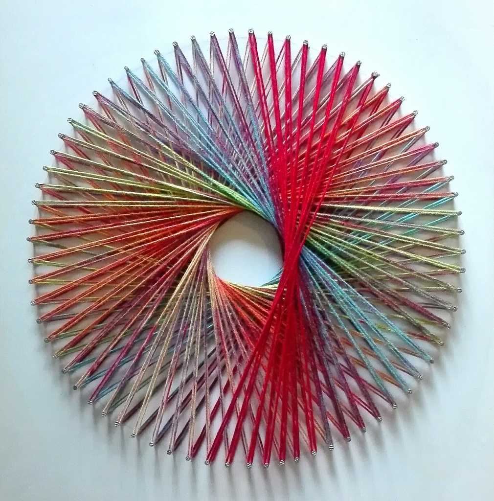 Een cirkel met spijkers omwikkelt en omgevormd met gespannen draad dat van kleur verandert.