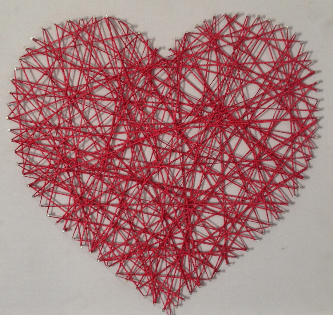 Een hart gevormd met spijkers (op hout) omwikkeld en gevuld met rood draad.
