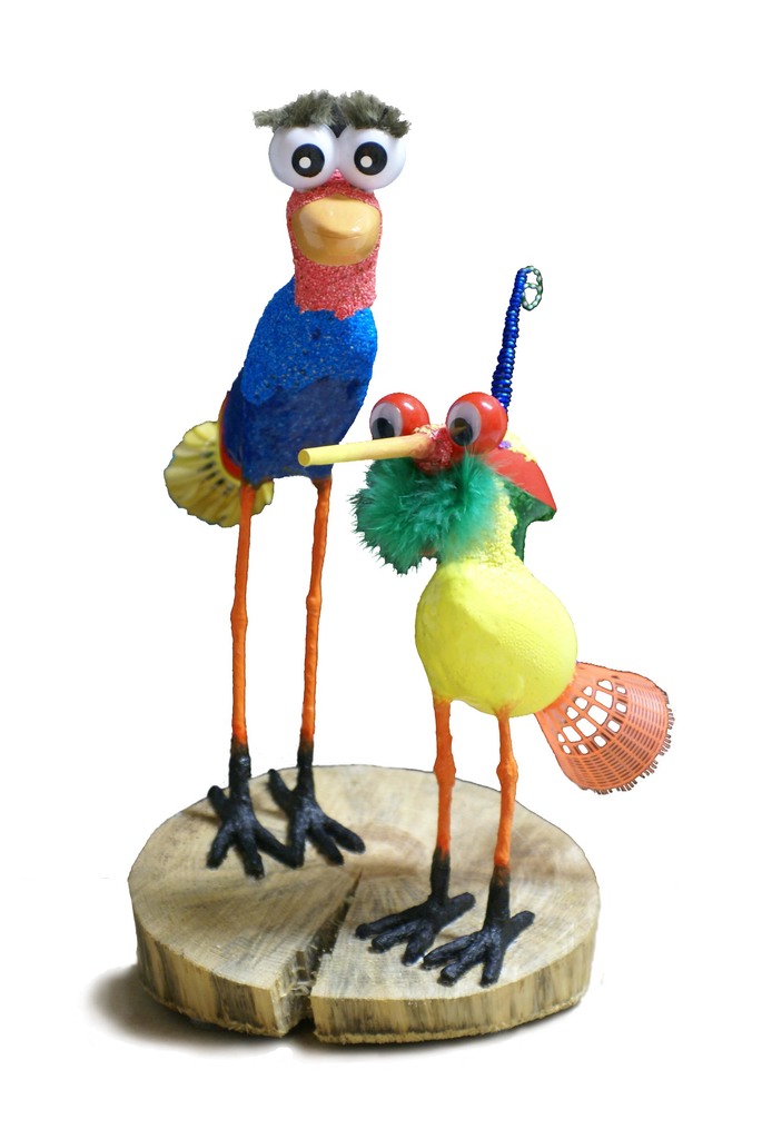 dubbele vogel op houten sokkel gemaakt van lege flacon schooonmaakmiddel en plastic citroen