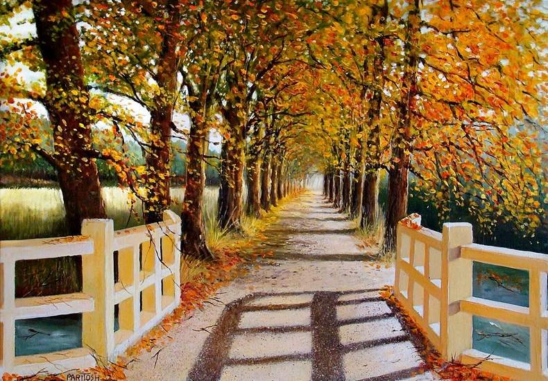 Realistische voorstelling van brug met in verlengde een laan met herfst bomen. Geschilderd met acrylverf op doek.
