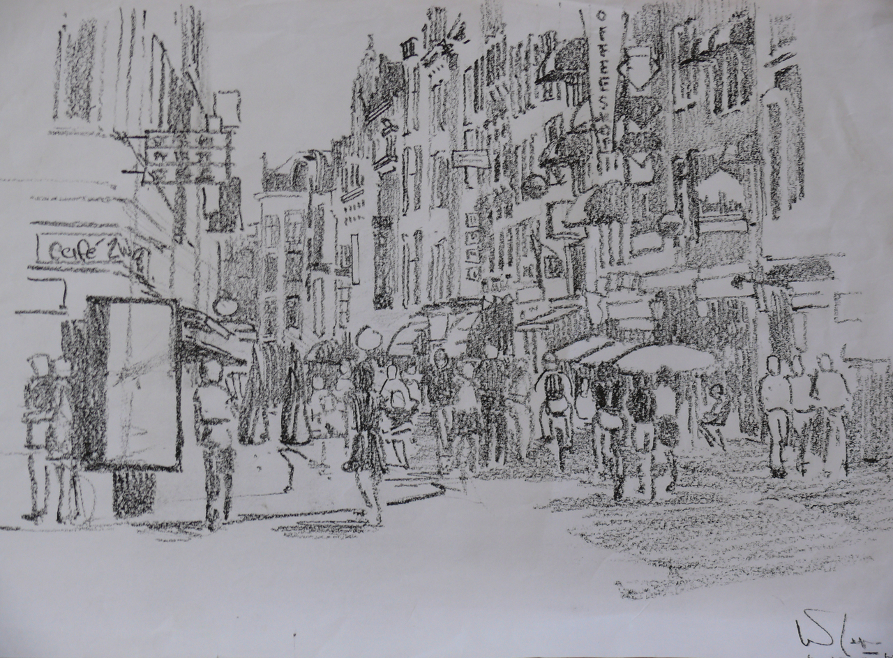 Ik ben autodidact en schilder en teken sinds 1950. Techniek: acryl opdoek, zwart wit tekeningen en aquarellen. Onderwerp: landschappen, stadsgezichten, cafés en terrassen met veel mensen.