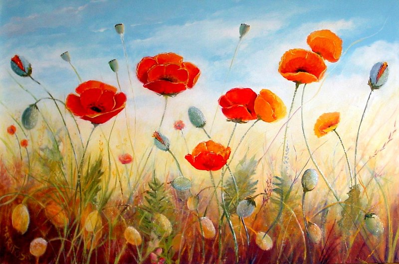 Een fantasie van klaprozen in diverse kleurnuances. Acryl op doek met baklijst.