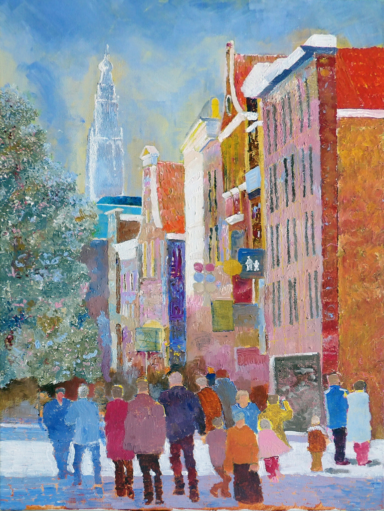 Ik ben autodidact en schilder en teken sinds 1950. Techniek: acryl opdoek, zwart wit tekeningen en aquarellen. Onderwerp: landschappen, stadsgezichten, cafés en terrassen met veel mensen.