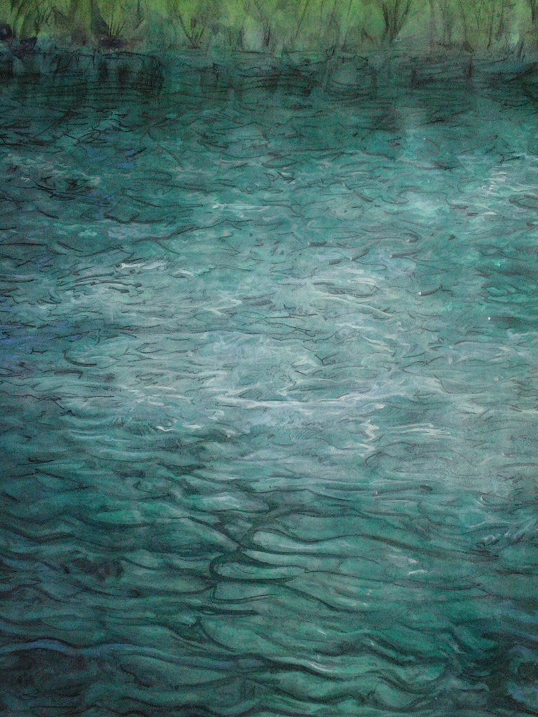 Wateroppervlak met gevarieerd handschriftelijke golven, aan de bovenzijde begrensd door een oever met riet.