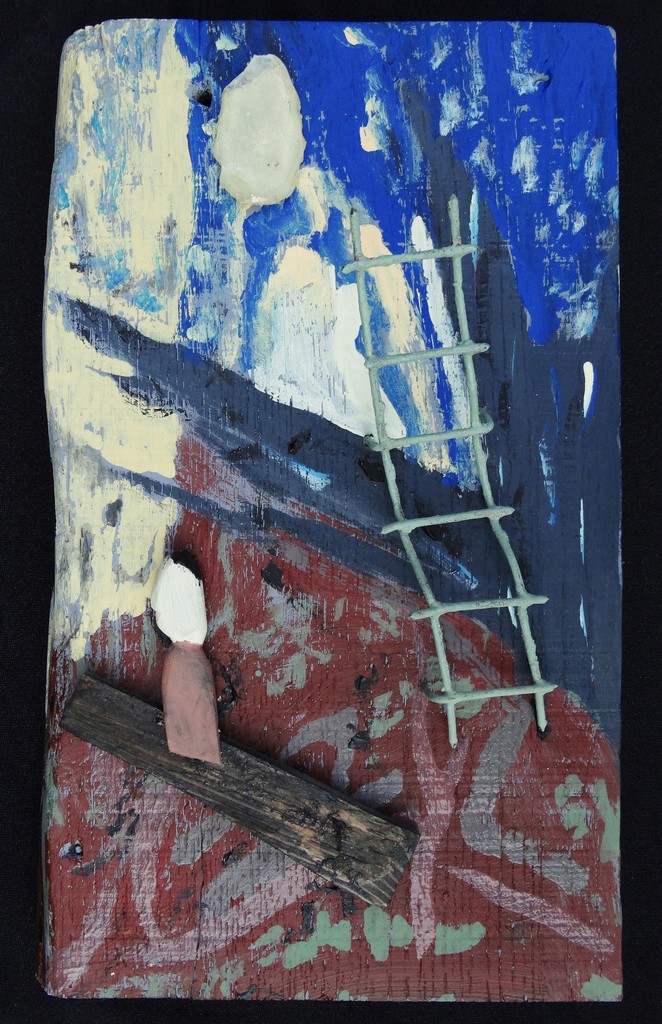 Syllabe Bas, bas / en bas / speel / geen noot / te hoog // gespeeld / in alle / ernst. (Assemblage, abstracte figuratie, hout, metaal, glas, verf)