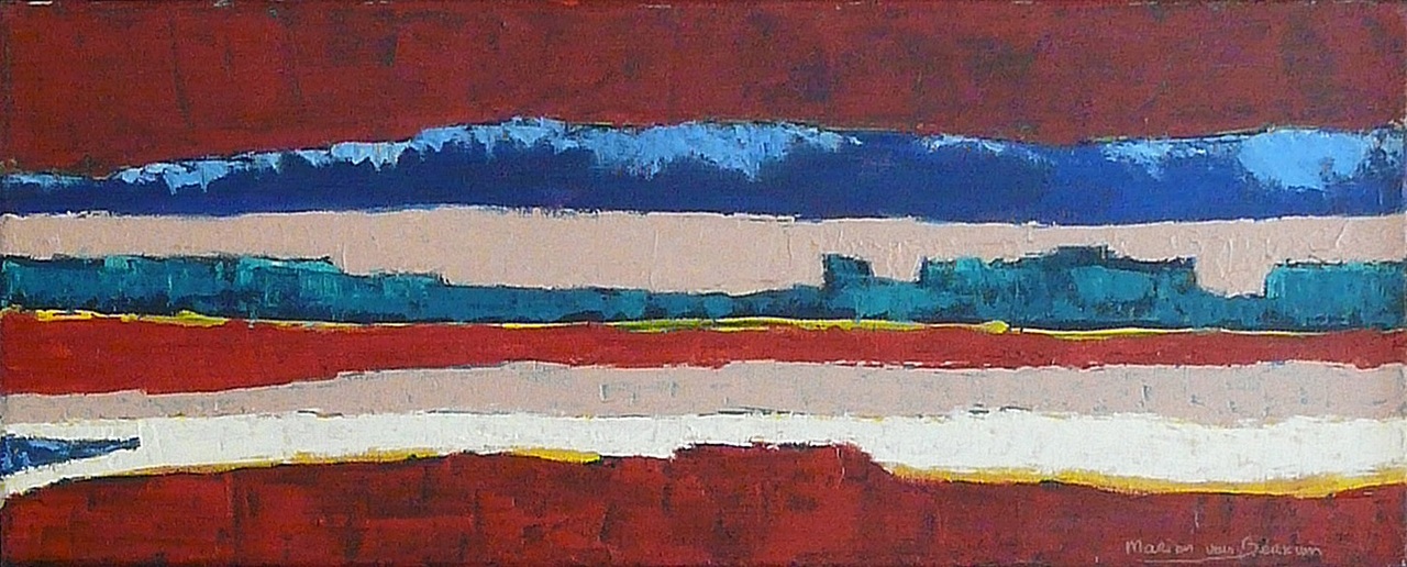 Dit landschap is geïnspireerd op Nicolas de Staël. De acrylverf is met het paletmes opgebracht.