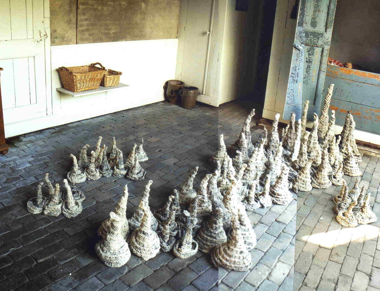 HEMELBESTORMERS Ze hebben allemaal hun dromen. Kleine mensen, grote dromen. Wensen. Utopieën. Dromend over wat ze zouden willen, zouden willen kunnen, bestormen ze de hemel. Dromend over hoe de wereld er uit zou kunnen zien. In elkaars nabijheid stuwen ze zichzelf en elkaar op. Grote dromen van kleine mensen. Haalbaar of utopisch. Ze houden hen op de been. Wat zou de wereld zijn zonder deze dromers? 91 Hemelbestormers, gehaakt van handgesponnen schapenwol van Drentse heideschapen. In een naïeve maar vastberaden poging om door middel van uren van noeste arbeid een gedroomde wereld te verwezenlijken. Ze hebben de ruimte ingenomen van een klein arbeidershuisje tijdens Grensloos Kunst Verkennen in De Wijk, september 2015 (www.grenslooskunstverkennen.nl).