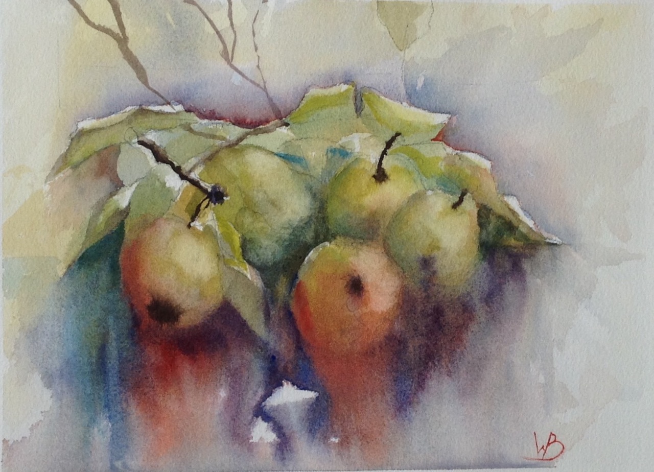 Een aquarel van appels , het is nat in nat geschilderd, zo veel mogelijk los gewerkt.