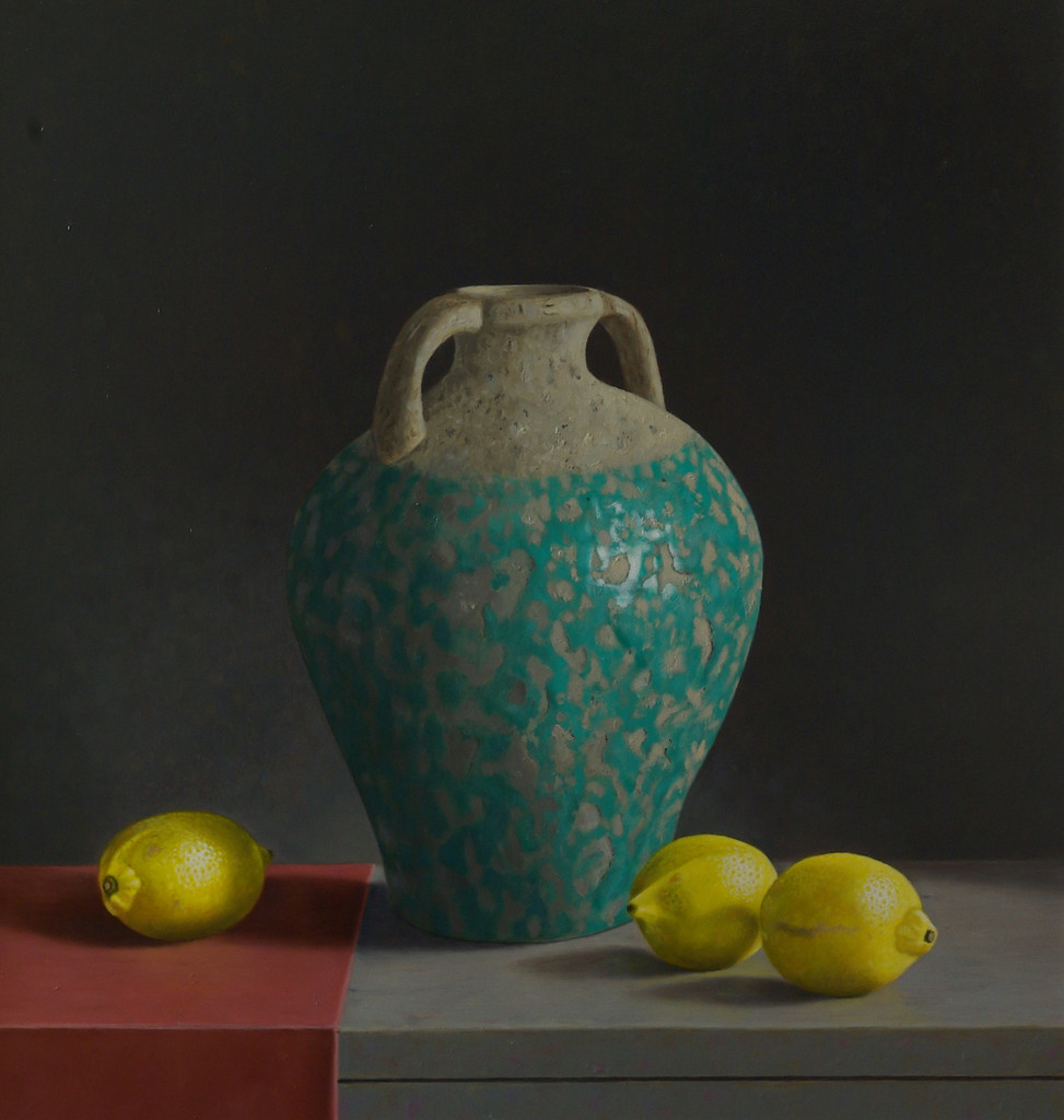 In dit stilleven staat de gele kleur van de citroenen in contrast met de groene kleur van de kruik.
