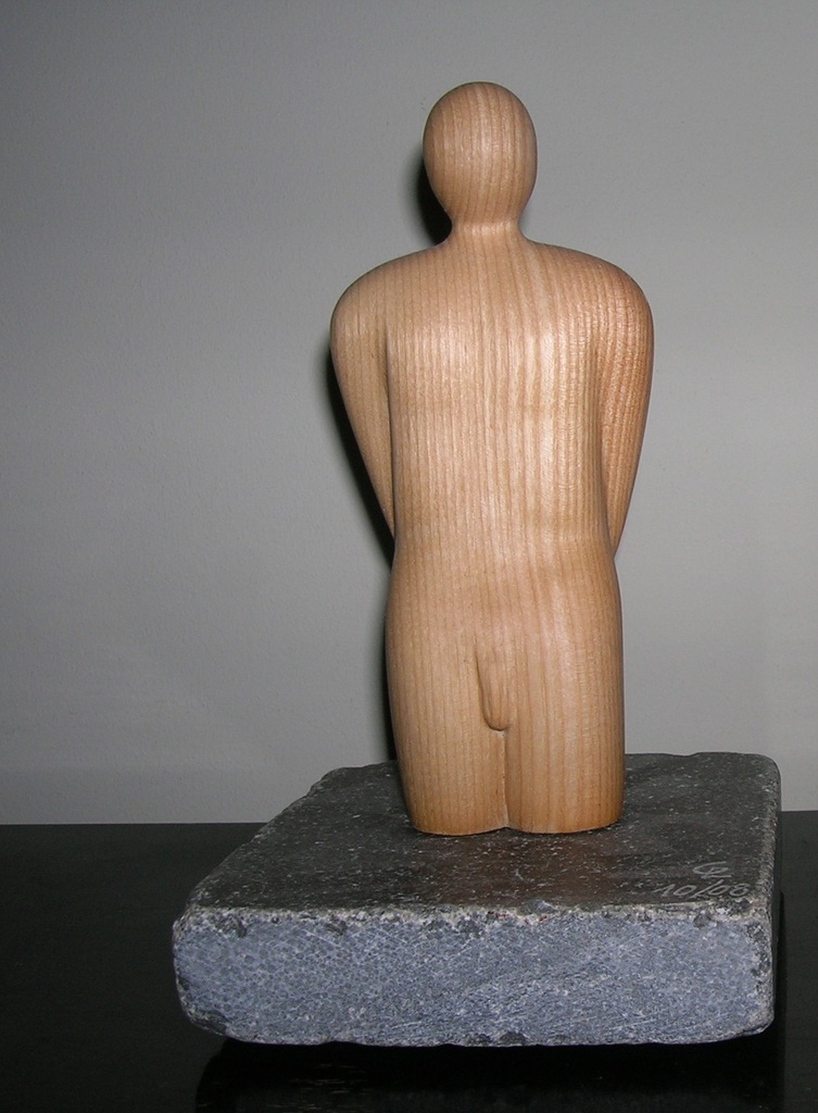"Oervader" (16x5x5cm) - oktober 2008. Rode Noorse Den op getrommelde blauwe steen. Bedoeld als aanvullende tegenpool van Oermoeder. In 2014 als cadeau geschonken aan een bijzonder man. IN PRIVEBEZIT