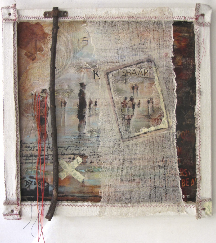 'N MOMENT LANG GELEDEN Vervaagde herinneringen op achterkant linnen en houten frame met papier, glas, verf, textiel, prints. Assemblage.
