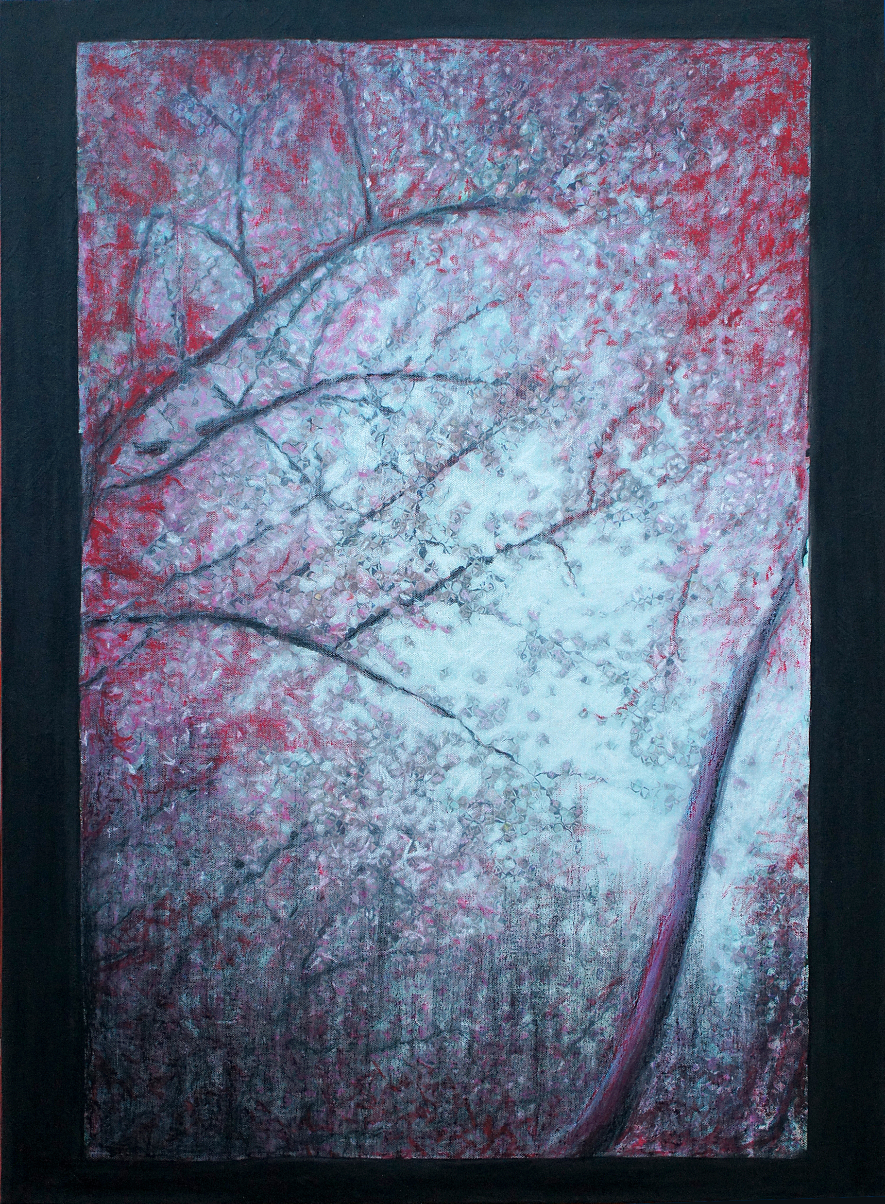 Summer, Bewerkt met Terpentine, oliepastel en potlood | Zwarte frame is onderdeel van het doek | zijkanten van het opgespannen doek zijn rood.