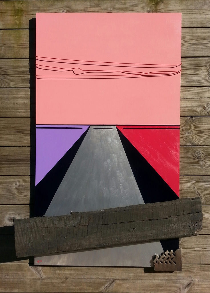 Dit werk is een reliëf in mixed media (acryl, hout polyester en metaal) en gaat over grenzen. Stukken land die aan elkaar grenzen. Een hek dat een stuk land begrensd, maar ook over de grenzen van het kader gaat. Bovendien komt de plank uit het schilderij.