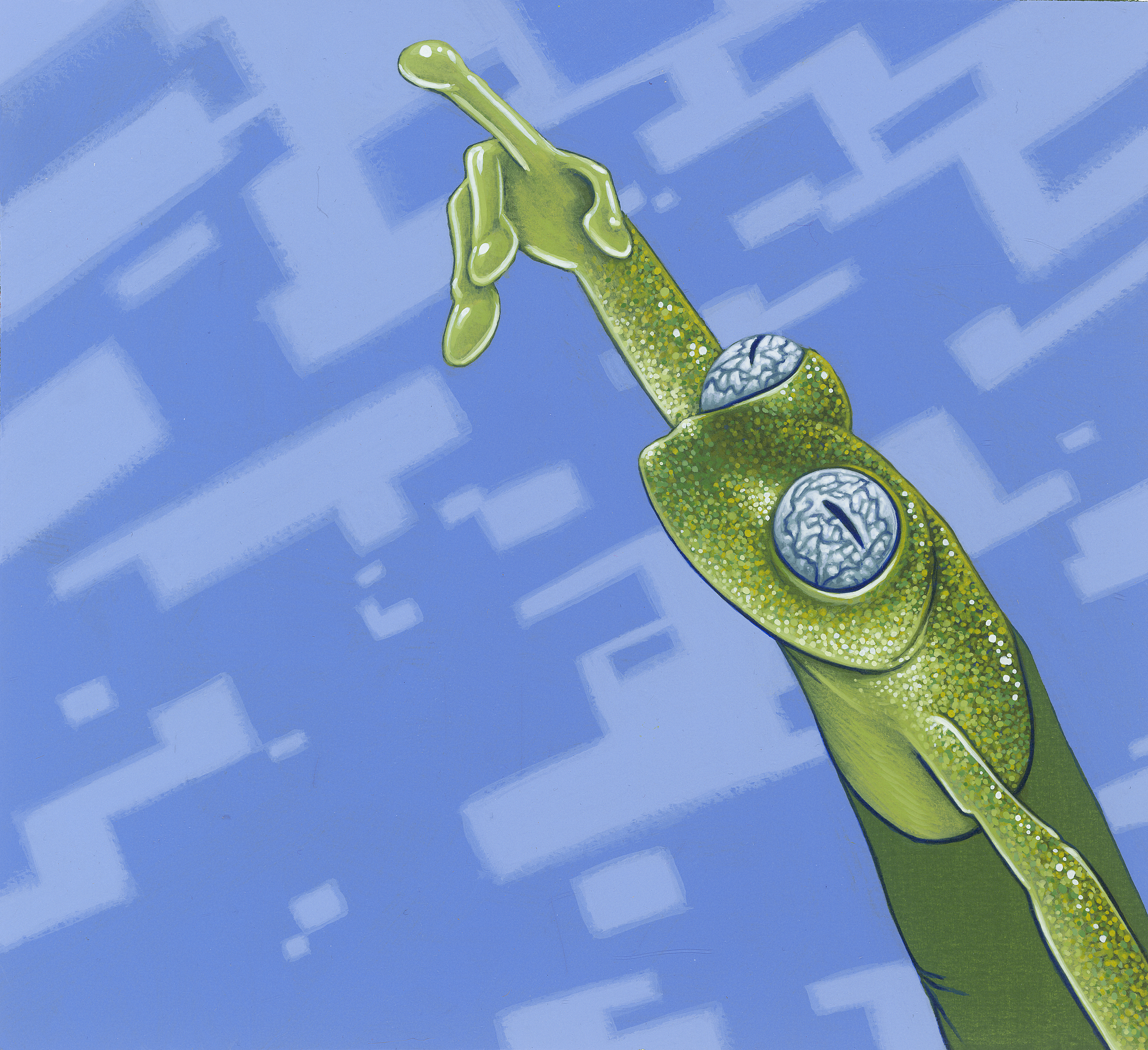 Schilderij Acryl Kikker Schilderijen Stippen Blauwe Vinger Realisme Hemel Illustratie Groene Kunstenaar Groningen Surrealism Kikkers Tentoonstelling Illustrator Vierkanten Jasper Oostland Boomkikkers Treefrog Figuurlijke Hyalinobatrachium Wijzende