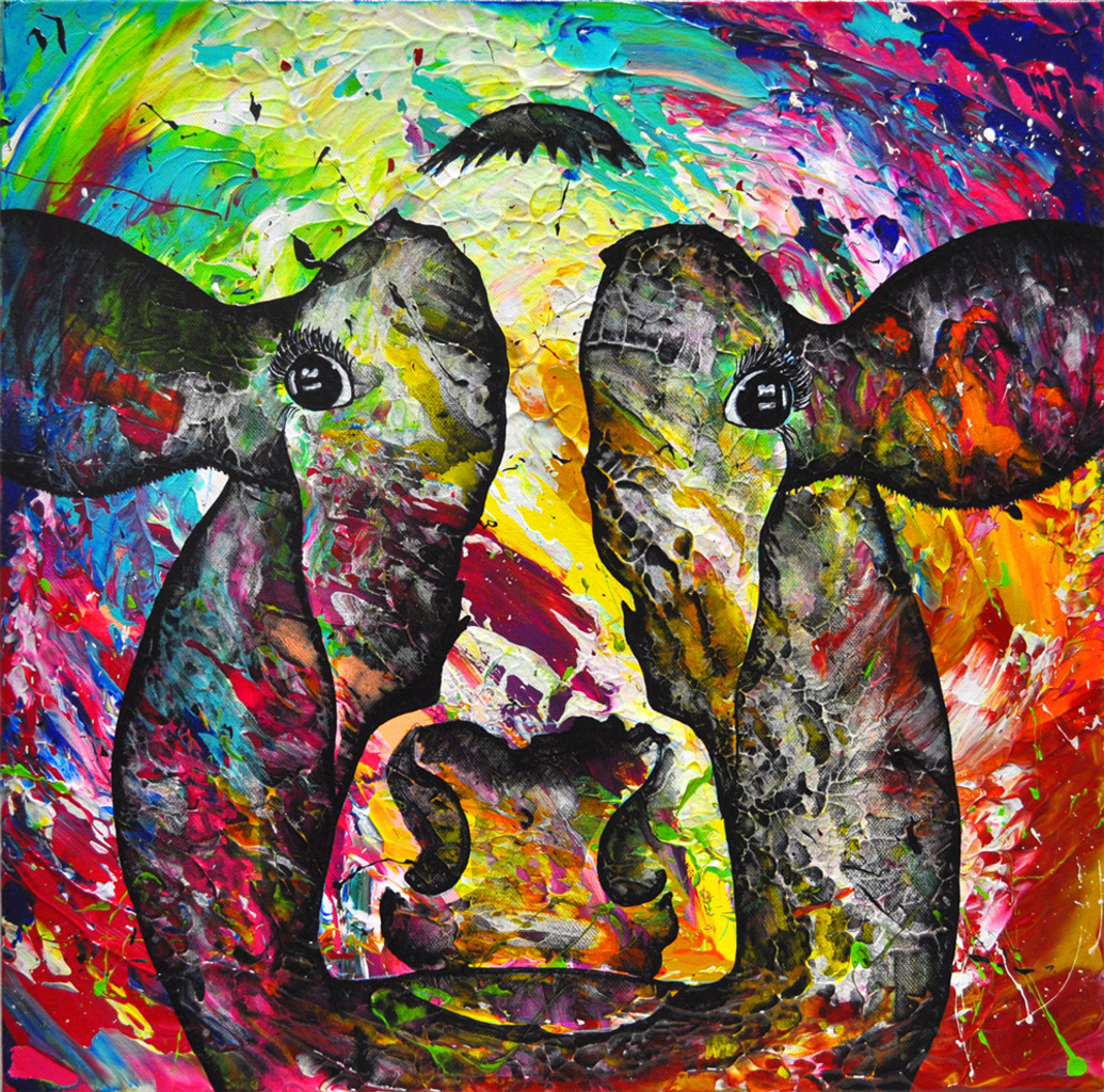 VERKOCHT. Kleurrijk koeienschilderij. 50x50x4cm, achtergrond dikke acrylverf en de koe in olieverf.