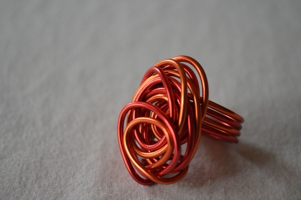 Van rood en oranje aluminiumdraad gevormde ring in een wirwar vorm.