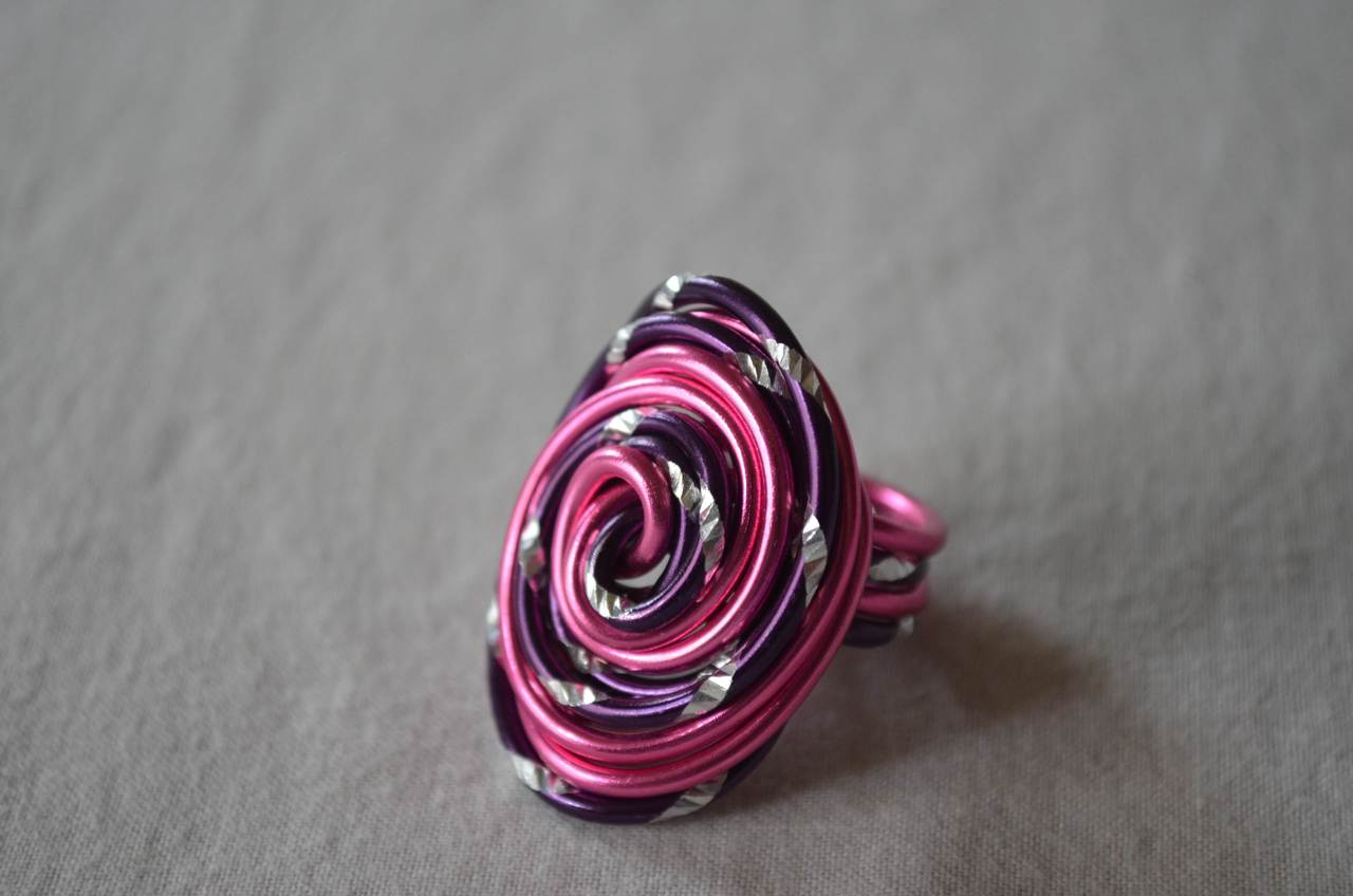 Van roze en paars diamond aluminium draad gevormde ring. De draaden zijn rondgevormd waardoor ing plat om de vinger zit.