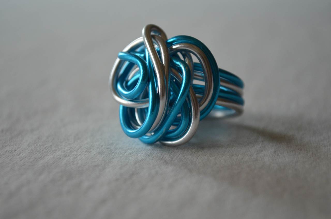 Van blauw en zilver aluminium draad gevormde ring in spiraal.