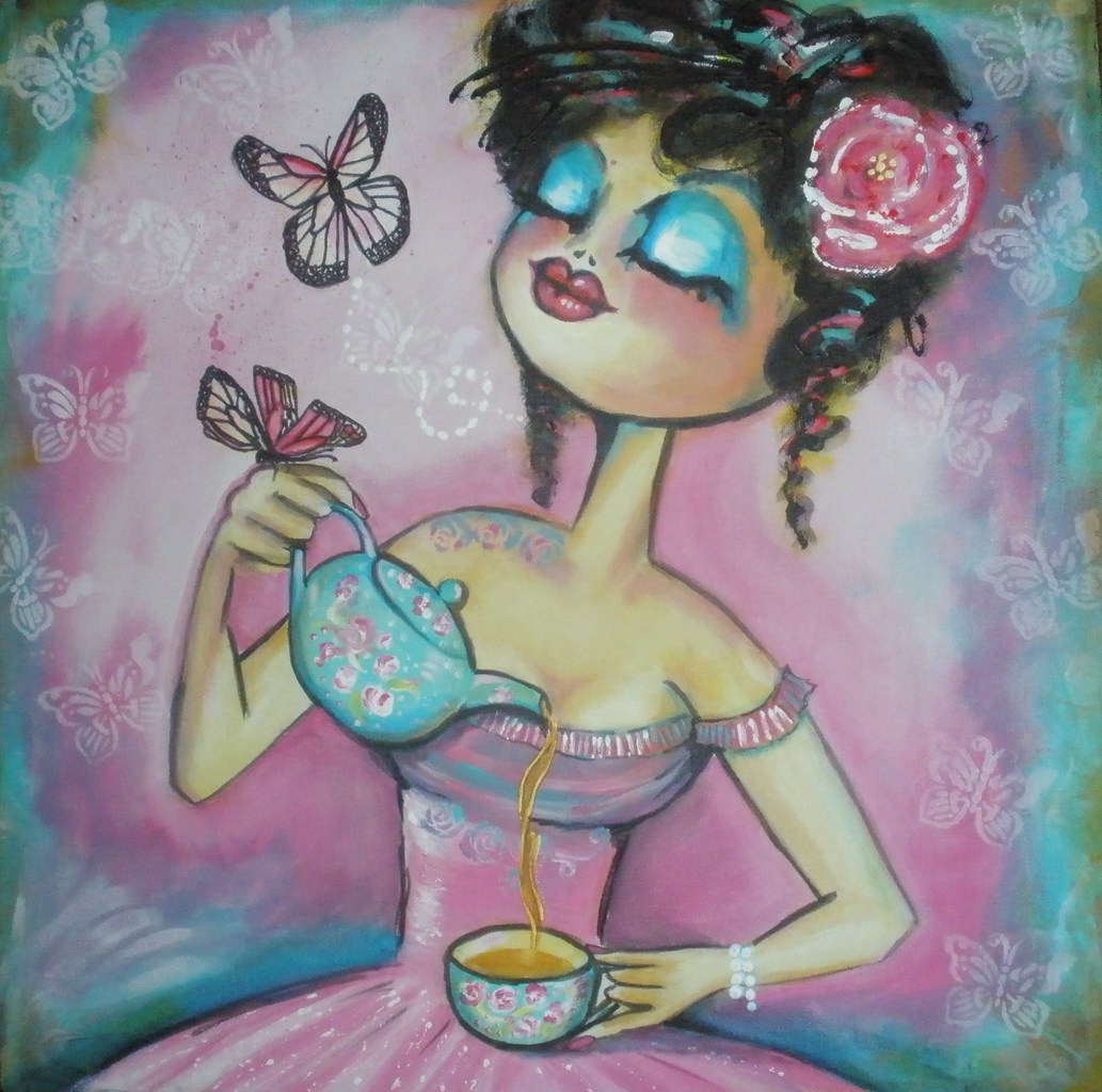 Schilderij met dame die thee drinkt.