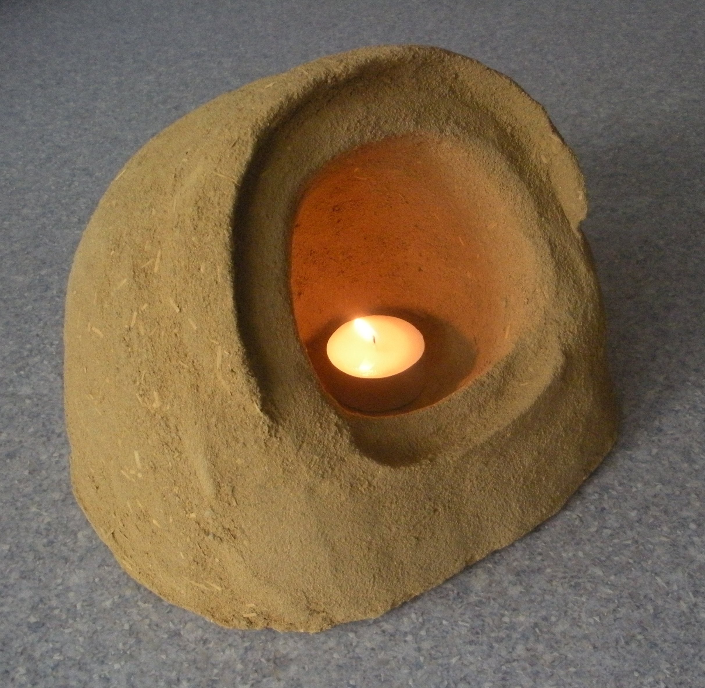 Een grot(je) gemaakt van bruine leem. Er kunnen zowel een klein als groot waxinelichtje in.