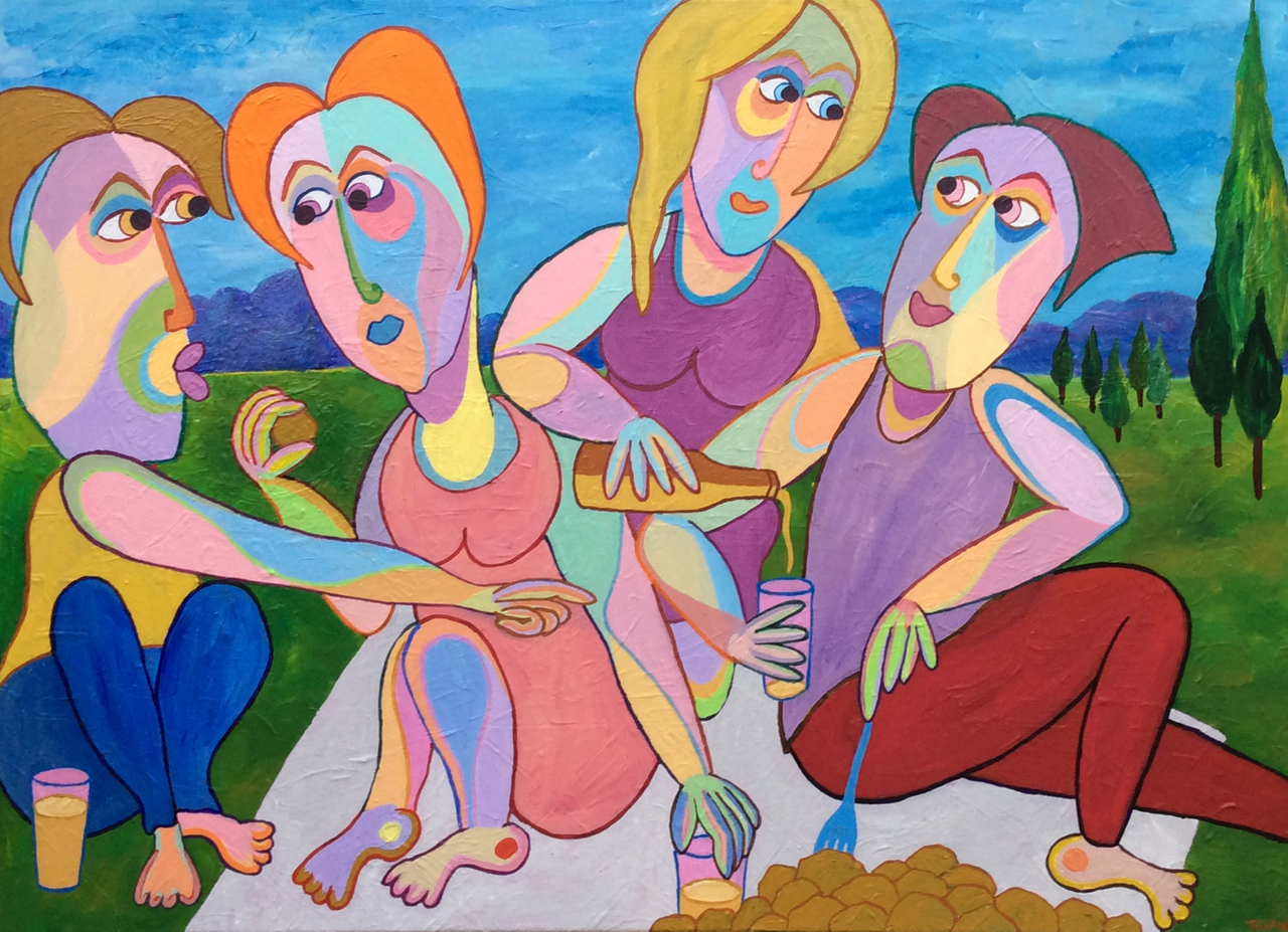 Geïnspireerd op De aardappeleters van Vincent van Gogh in combinatie met Le dejeuner sur l' herbe van Manet