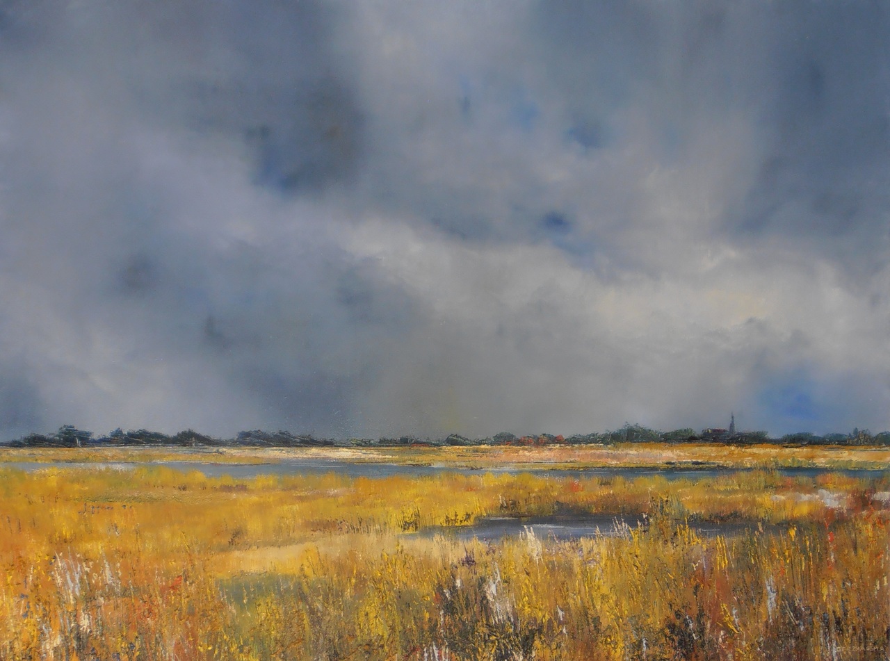 Realistische aquarellen en olieverf schilderijen van Hollands landschap, met altijd expressieve luchten boven de lage horizon zich spiegelend in de waterrijke polder. Ook werken uit de Franse Morvan en van de Oostelijke Algarve in Portugal.