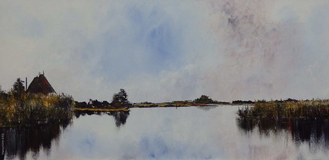 Realistische aquarellen en olieverf schilderijen van Hollands landschap, met altijd expressieve luchten boven de lage horizon zich spiegelend in de waterrijke polder. Ook werken uit de Franse Morvan en van de Oostelijke Algarve in Portugal.