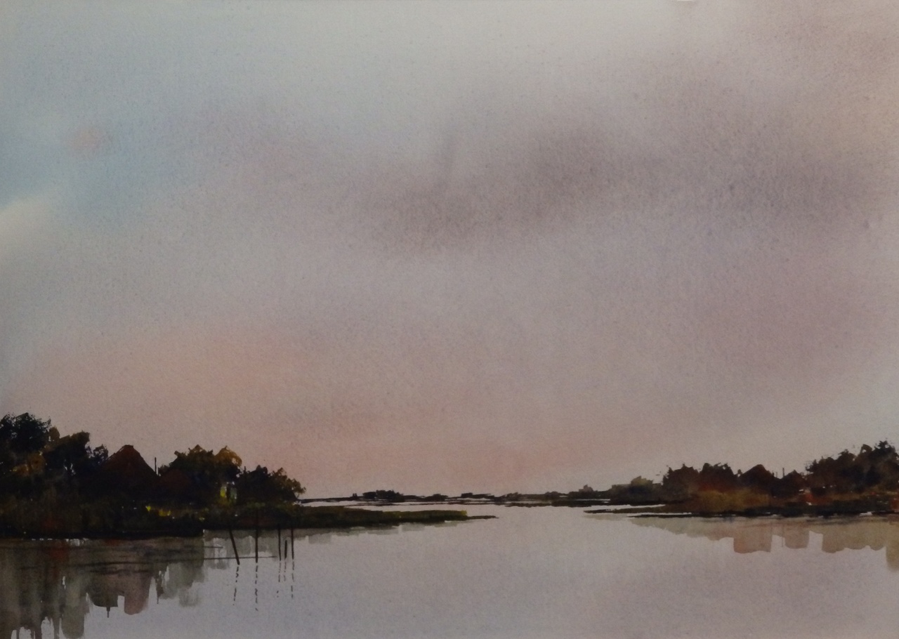 Realistische aquarellen en olieverf schilderijen van Hollands landschap, met altijd expressieve luchten boven de lage horizon zich spiegelend in de waterrijke polder. Ook werken uit de Franse Morvan en van de Oostelijke Algarve in Portugal.