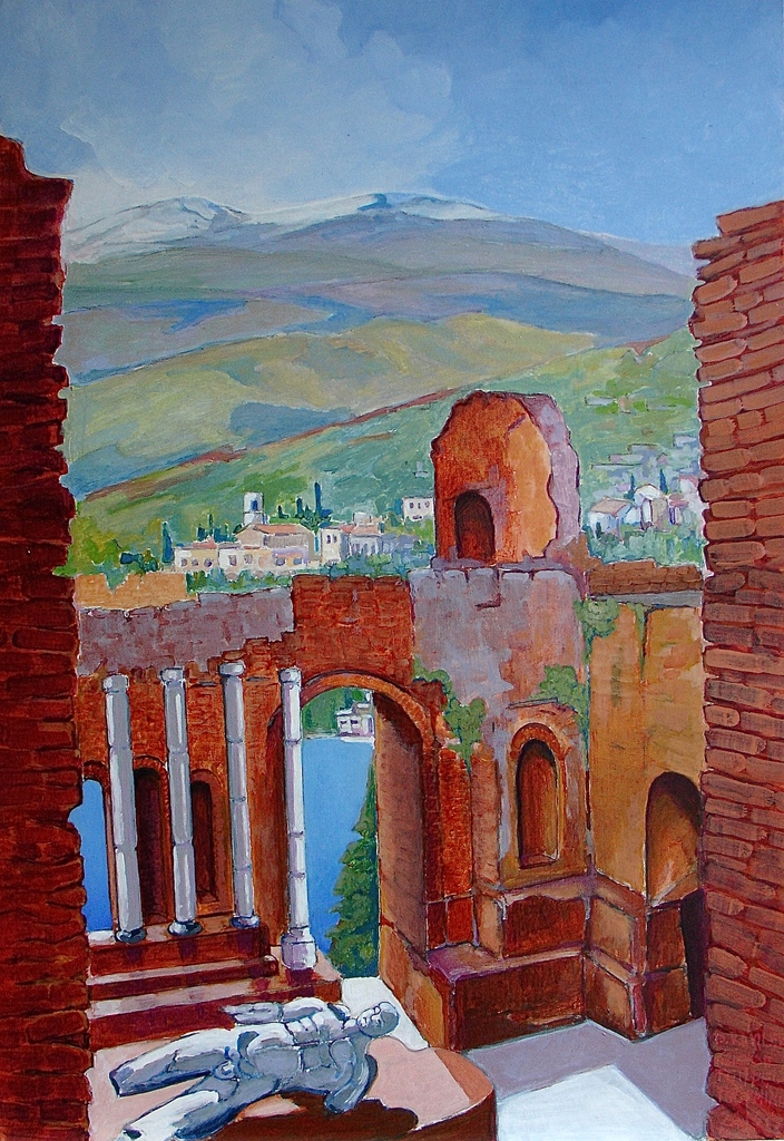 Oude Griekse tempel in Taormina met zicht op de Vesuvius