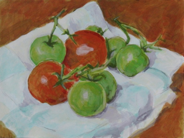 In dit stilleven worden een aantal tomaten op een theedoek weergegeven, getoond in verschillende stadia van rijpheid.