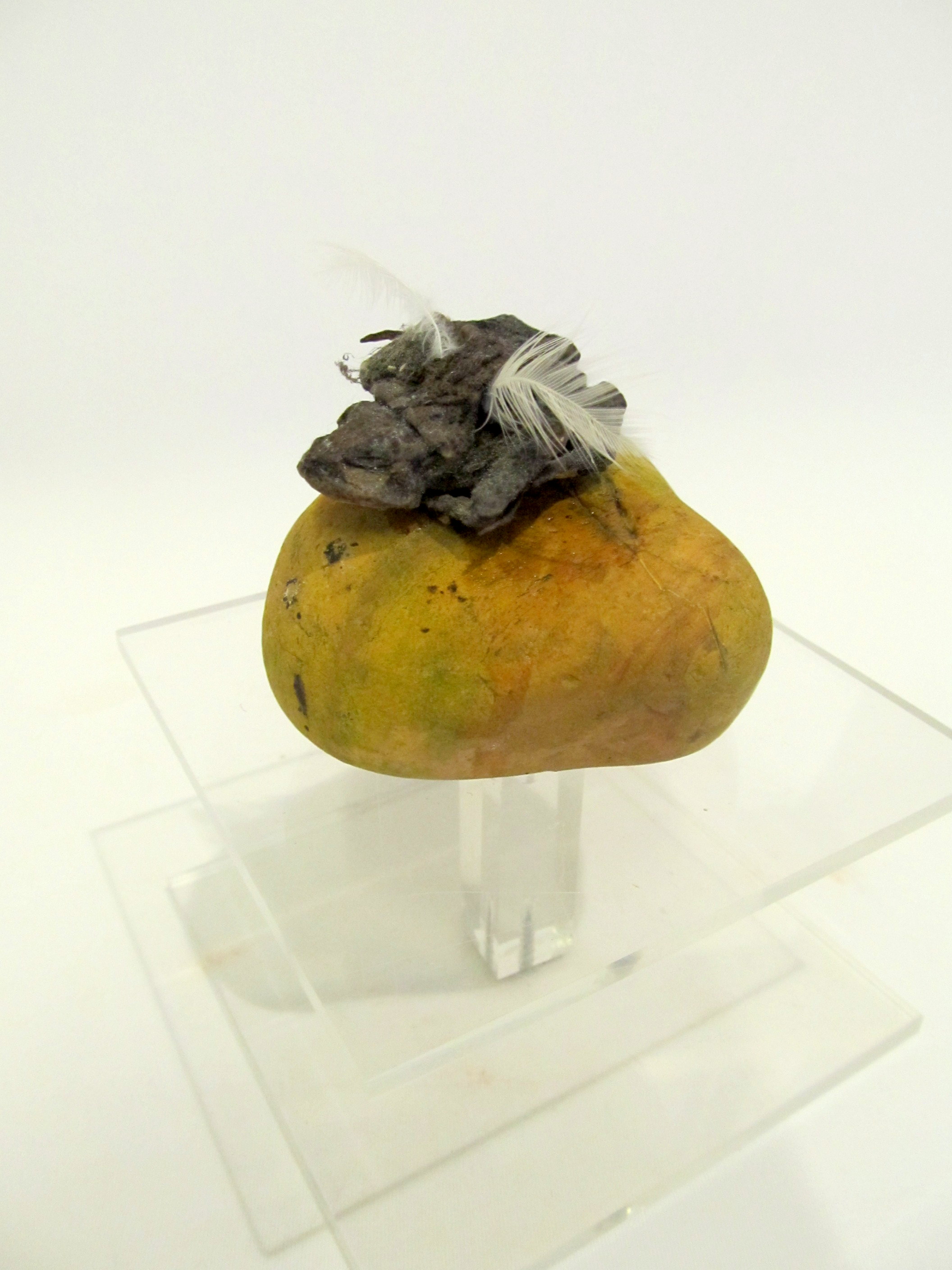 Dode kikker met vleugeltjes op een steen onder een stolp (niet op foto)