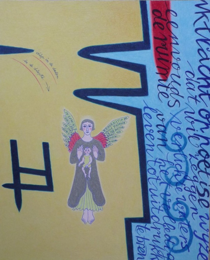 abstracte compositie met engel en tekst