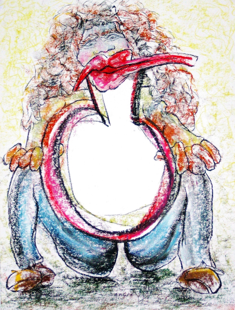 De getrainde lippen getuigen van een innemende onverzadigbare maag .. die als bron dan ook eindeloos is voor 't cultureel associatief brabbelend boeren.Baruch's vertaling: Stomach pouch. The trained lips testify and witness agreedy never burdened tub: infinite source for associations or jabb'ring cultural hiccup.