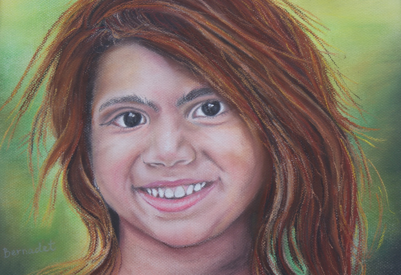 Meisje Kind Portret Krijt Gezicht Ogen Tekening Pastel Bruine Hoofd Haar Haren Uitdrukking Zoë