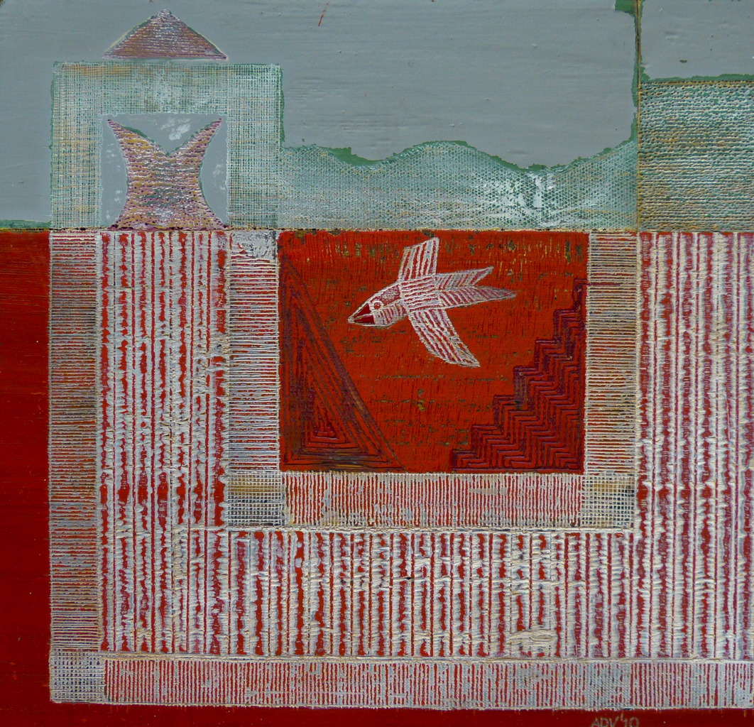 Drie samengevoegde plankdelen: rood en grijs. Bewerkt met verfkrabber, els, stanleymes. Onderlagen: lichtrood, zwart, groen. Toegevoegde kleuren: wit en donkerrood.