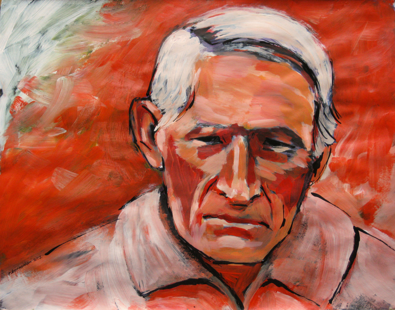 schets in acryl en oostindische inkt, kleurgebruik contrasterend met gezichtsuitdrukking