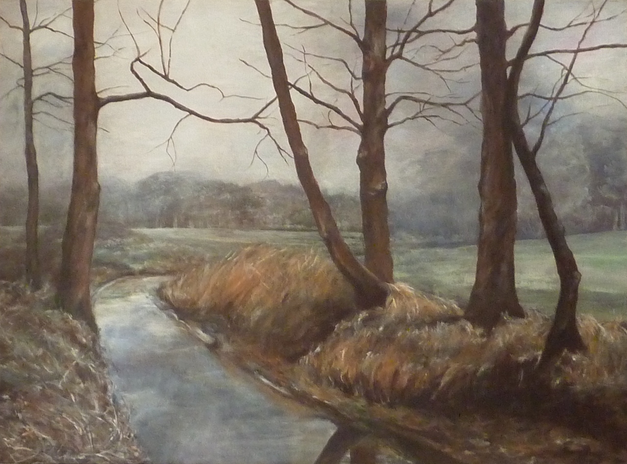 Winters landschap met beek en bomen.