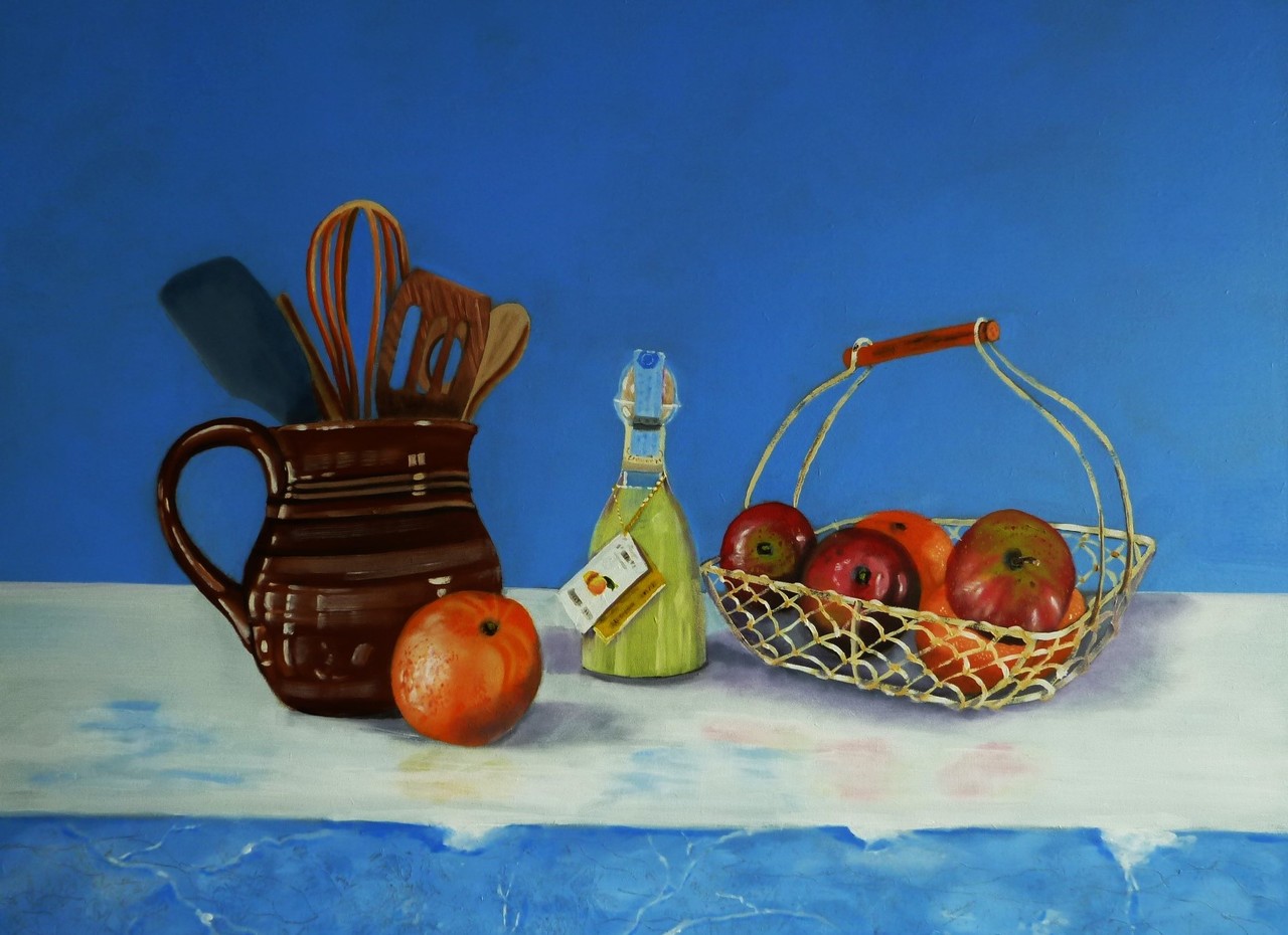 Rood Blauw Kleurig Bruin Steen Veel Tafel Keuken Appels Kan Spullen Mandje Sinaasappel Keukengerei