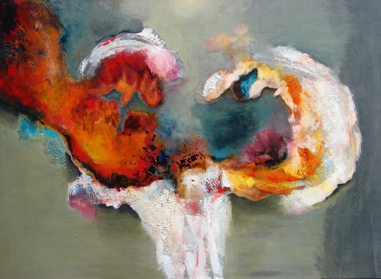 In veel rood geef ik een explosie in de ruimte weer. Acryl met kwast en mes gecombineerd met gebrand waterglas.