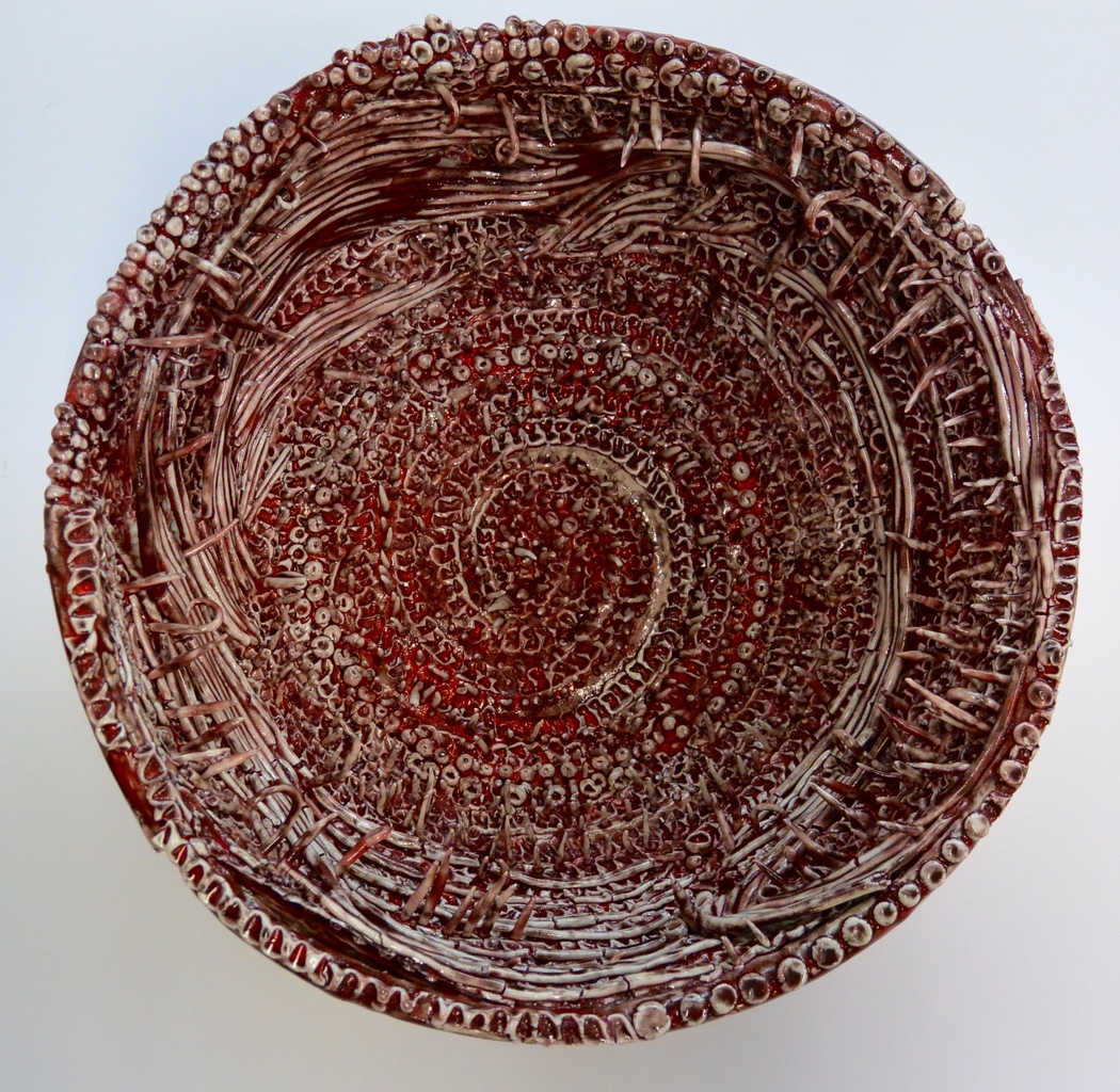 schaal/spiraalvorm van papiersteengoedklei, bedekt/gedecoreerd met porseleinen fragmentatie met een rood glansglazuur