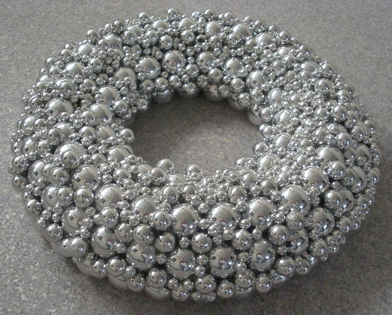 Een kerstkrans van glazen zilveren ballen.