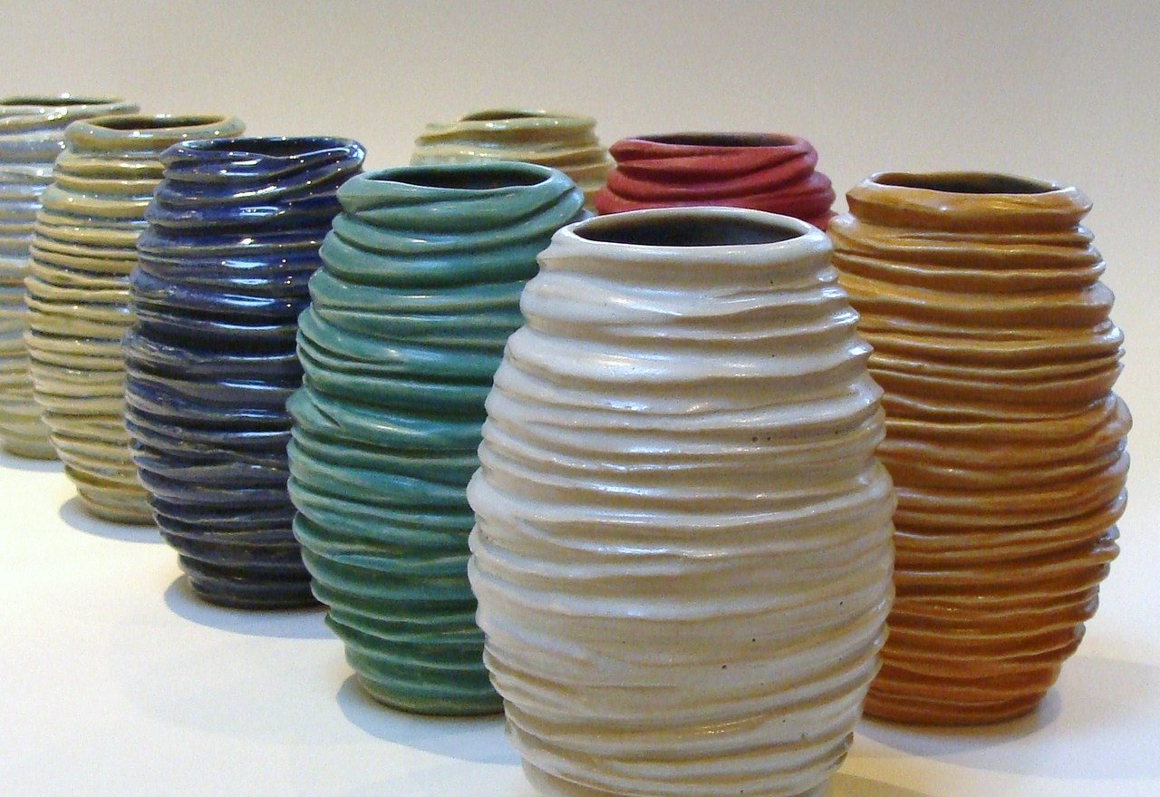 Bij dit vaasje draait het niet om de bijzondere vorm, maar de ritmisch gelaagde wand geeft de vorm een dynamisch uiterlijk.